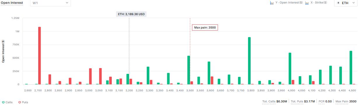 Significant Call writing is observed at the $3,500 strike, while notable Put writing is seen at the $2,700 strike on the lower side. The Put-Call Ratio (PCR) of 0.50 suggests a bearish market sentiment for the upcoming week.